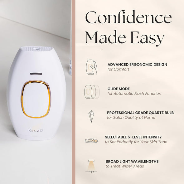 • Pain-Free Light-Based Technology: Say goodbye to expensive appointments, and say hello to Kenzzi's IPL technology. Our handheld laser at home hair removal targets unwanted hairs at the root without burning or damaging your skin. The light energy causes hair follicles to shed and slows down hair from growing back for long-term hair reduction. Also comes with a flash safety feature, so protective eyewear is not necessary upon use.